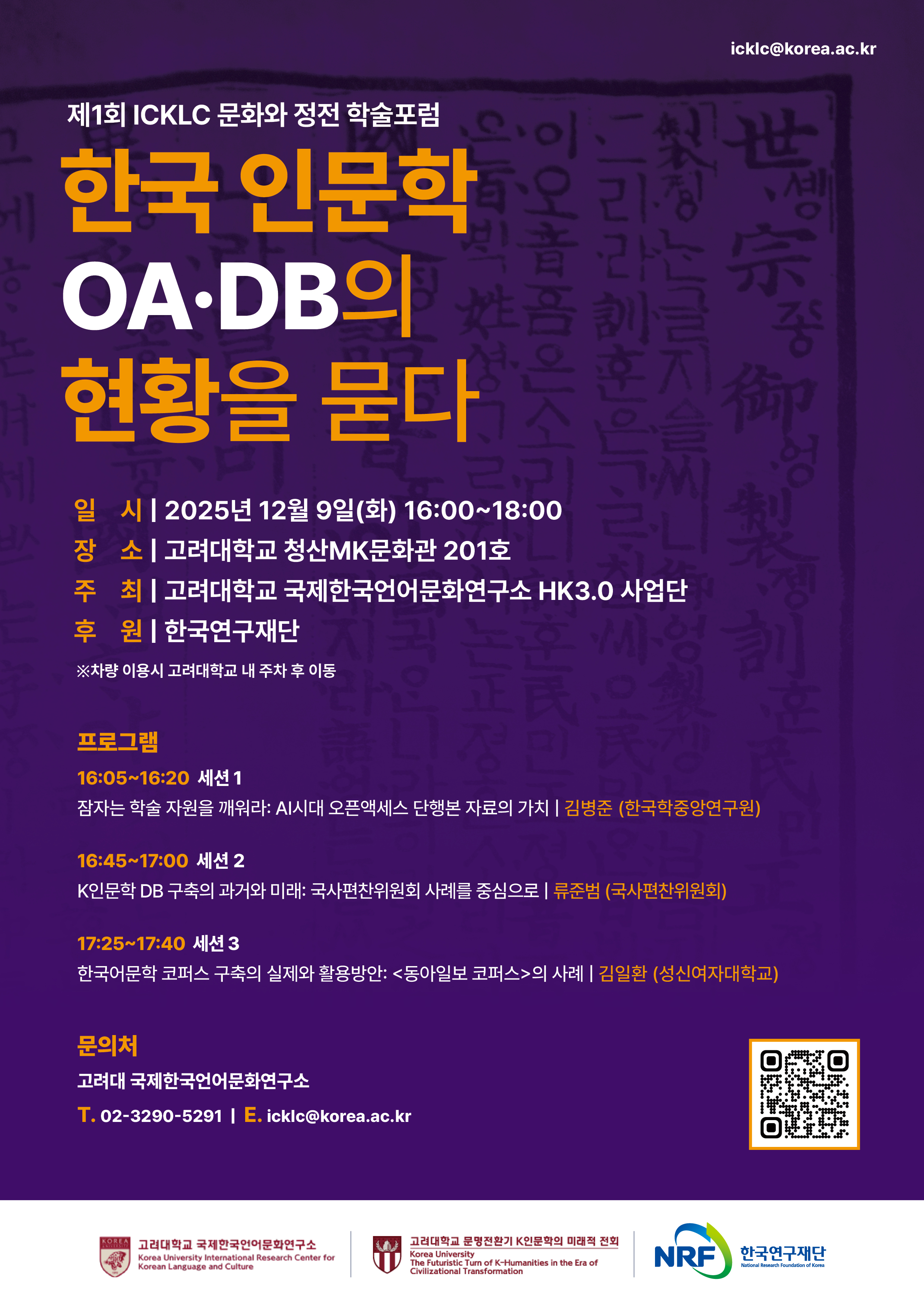 오는 12월 9일(화), 제1회 ICKLC 문화와 정전 학술포럼 "한국 인문학 OAㆍDB의 현황을 묻다"가 아래와 같이 개최됩니다.