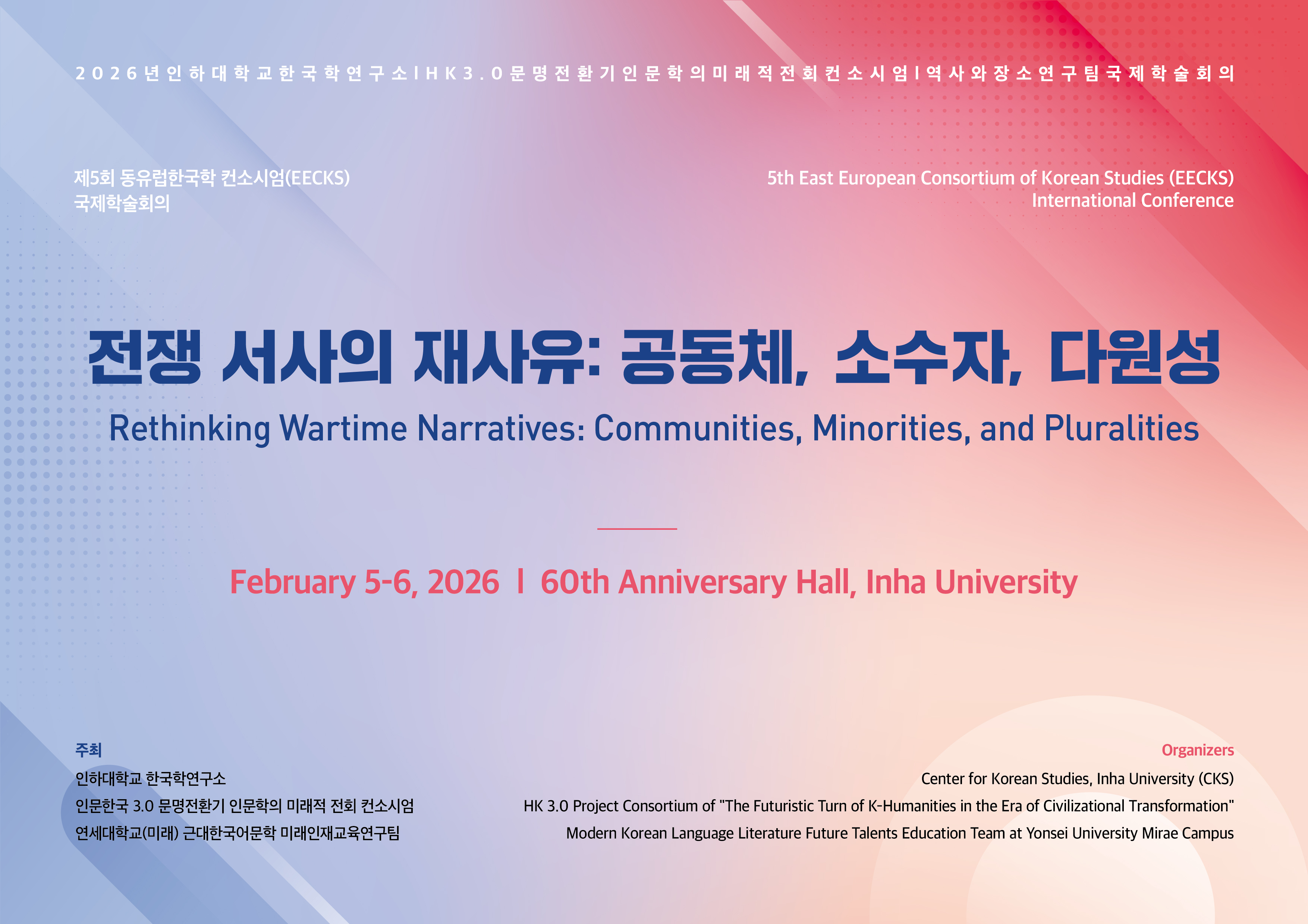 제5회 동유럽한국학 컨소시엄(EECKS) 국제학술회의 <전쟁 서사의 재사유: 공동체, 소수자, 다원성>이 오는 2월 5일(목) ~ 6일(금) 양일간 인하대학교 60주년 기념관에서 개최되어 안내 드리오니, 많은 관심과 참석 바랍니다.